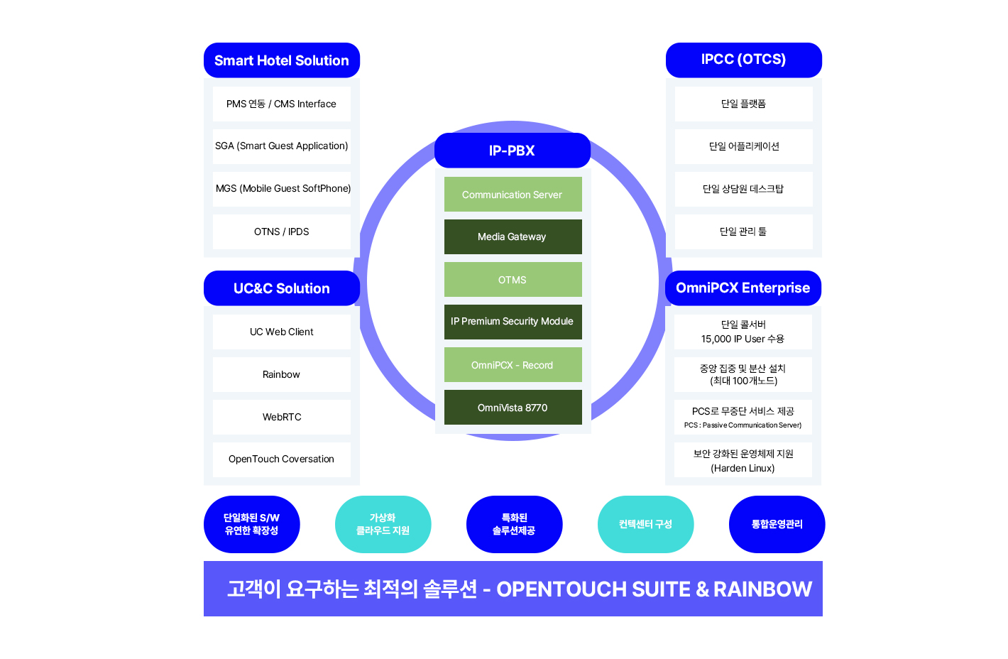 All-In-One 플랫폼, 중대용량 IP교환기, 가상화, 특화된 솔루션(공공, 호텔, 병원, 제조, 교육),