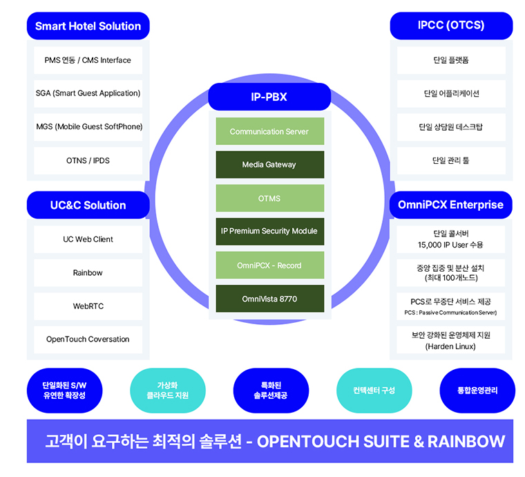 ALL IP 기반의 IP-PBX, IPCC, UC & C Solution, Smart Hotel Solution은 통합 커뮤니케이션 서비스를 필요로 하는 특화된 분야 (공공, 호텔, 병원, 교육,제조 등)의 다양한 요구사항을